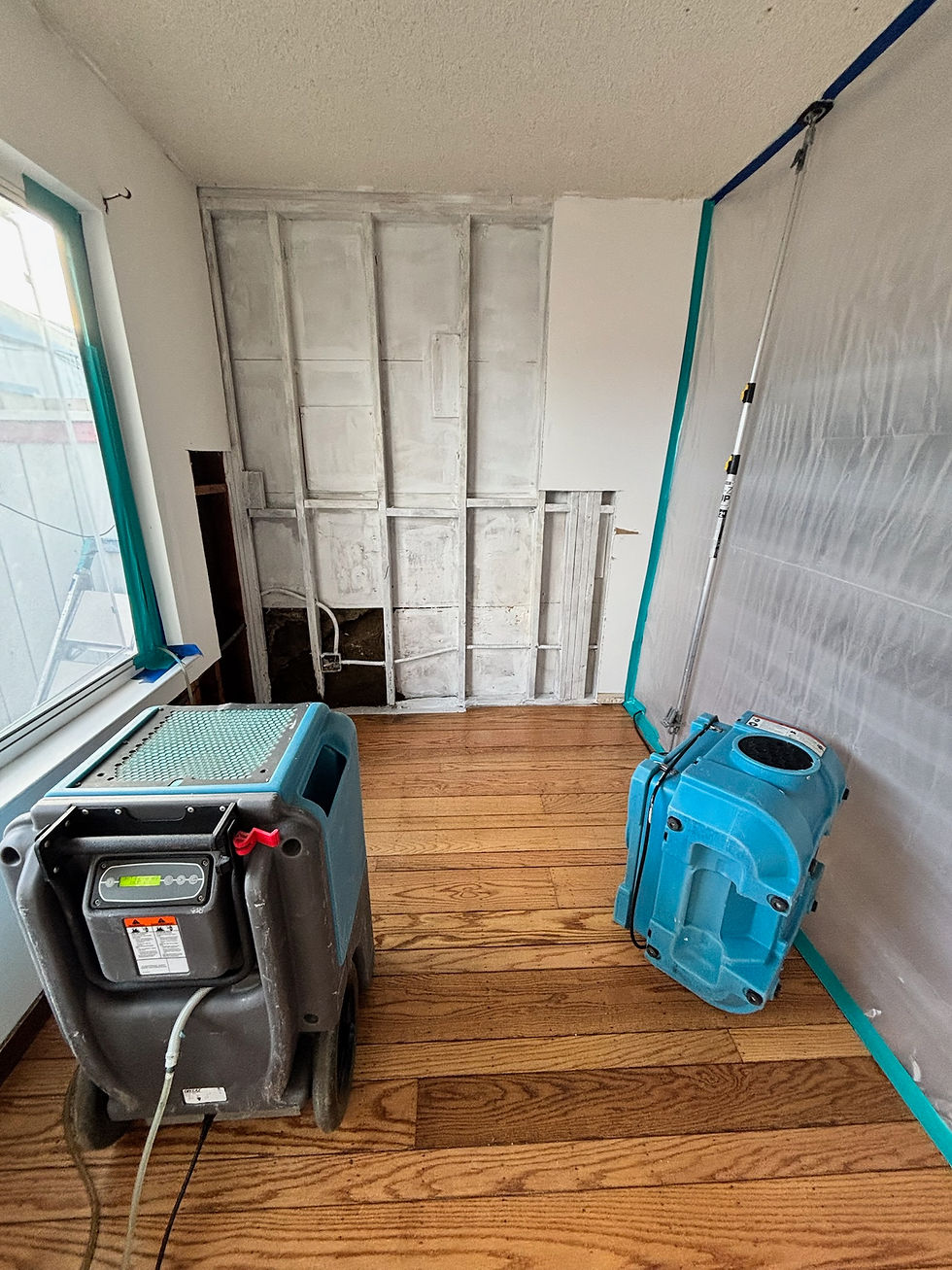 Drying equipment has been strategically placed to control moisture levels, and selective demolition has been performed to expose affected wall cavities. This allows proper drying, inspection, and remediation at the source, ensuring the area is treated correctly and prepared for the next phase of restoration.