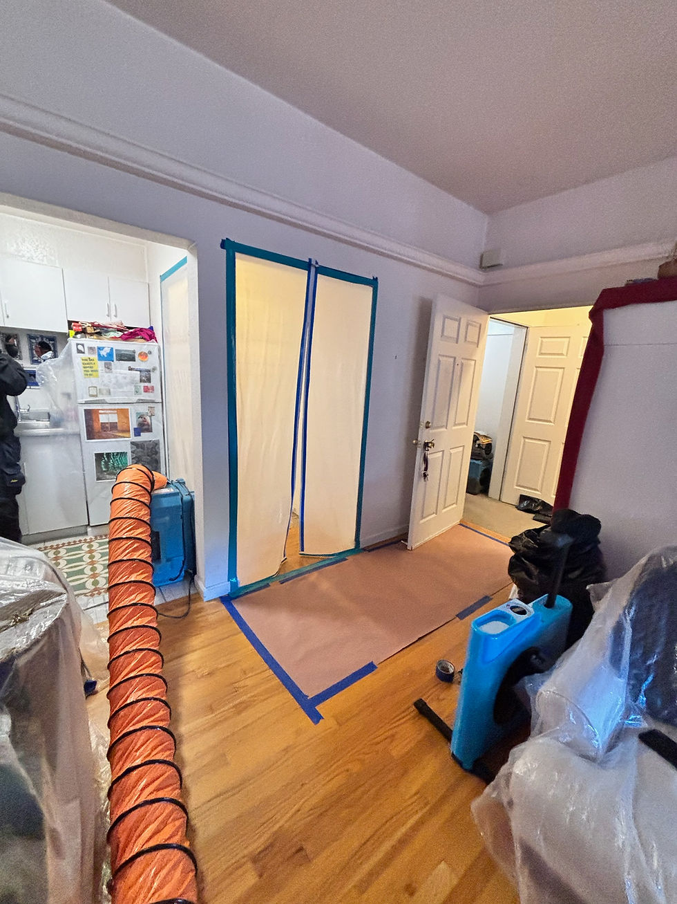 Containment area set up with sealed barriers and negative air system in place to isolate the workspace and prevent cross-contamination during the remediation process.